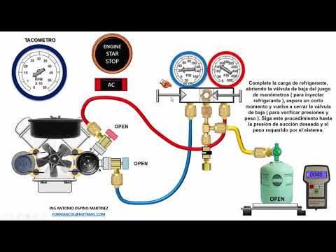 Conecta la manguera de carga del manómetro al puerto de carga del sistema de aire acondicionado. Una vez conectado, enciende el motor y enciende el aire acondicionado para que el sistema esté en funcionamiento.